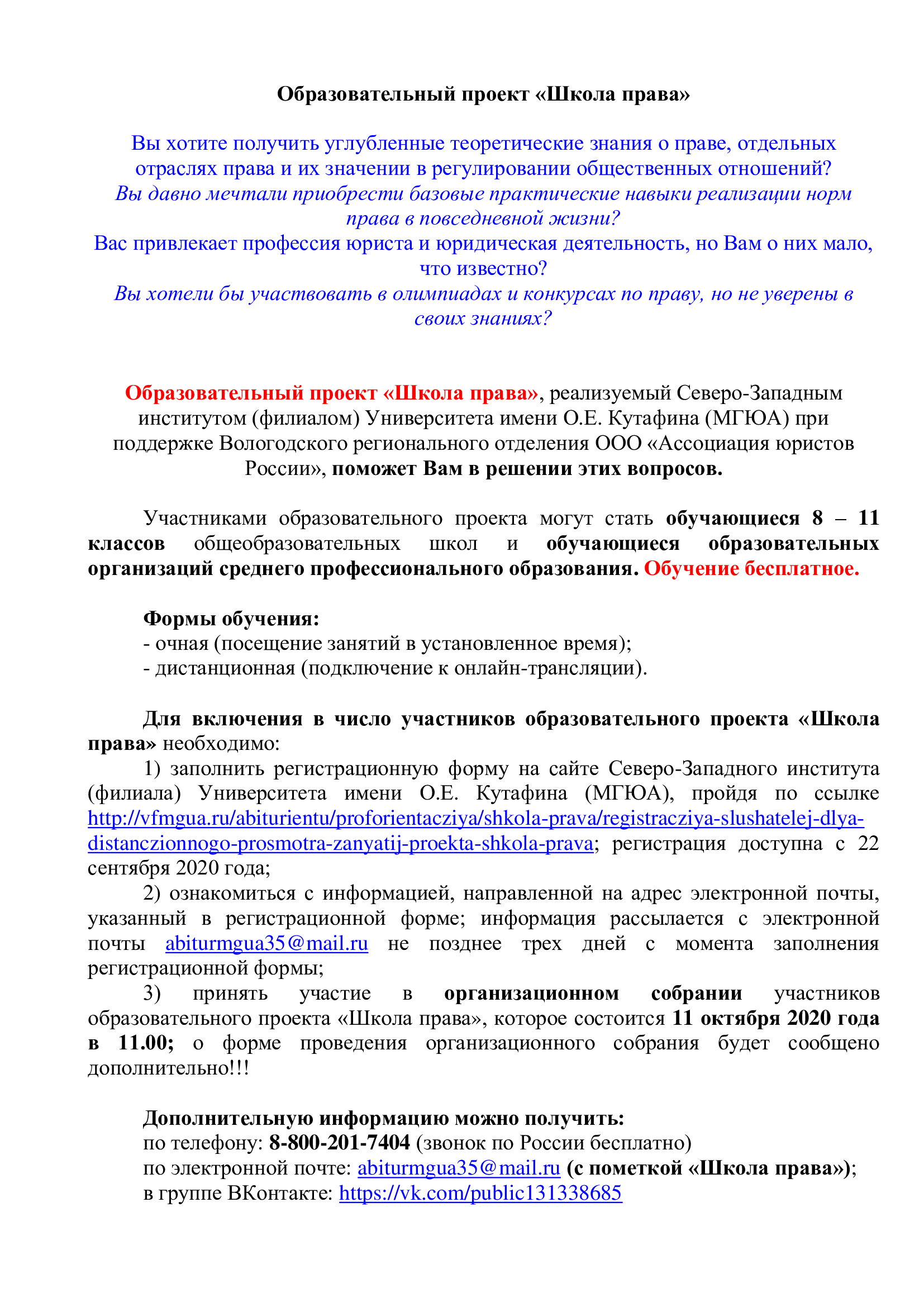 Северо-Западный институт (филиал) Университет имени О.Е. Кутафина (МГЮА) при поддержке Вологодского регионального отделения ООО «Ассоциация юристов России» реализует образовательный проект «Школа права».