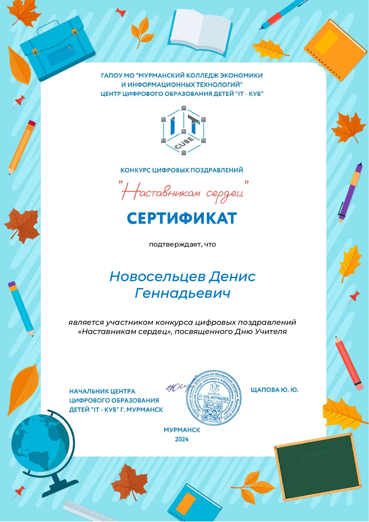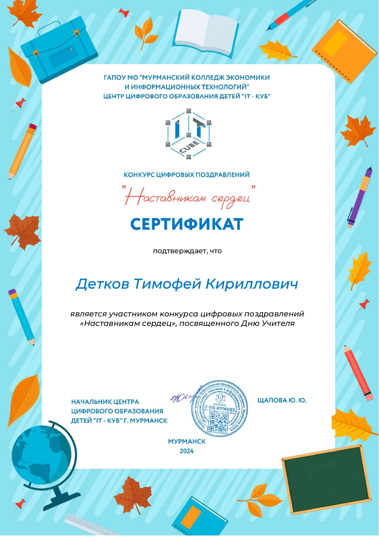 Обучающиеся Центра цифрового образования "IT-куб" приняли участие в конкурсе цифровых поздравлений «Наставникам сердец», посвященного Дню Учителя, организованного Центром цифрового образования «IT – куб» г. Мурманск.