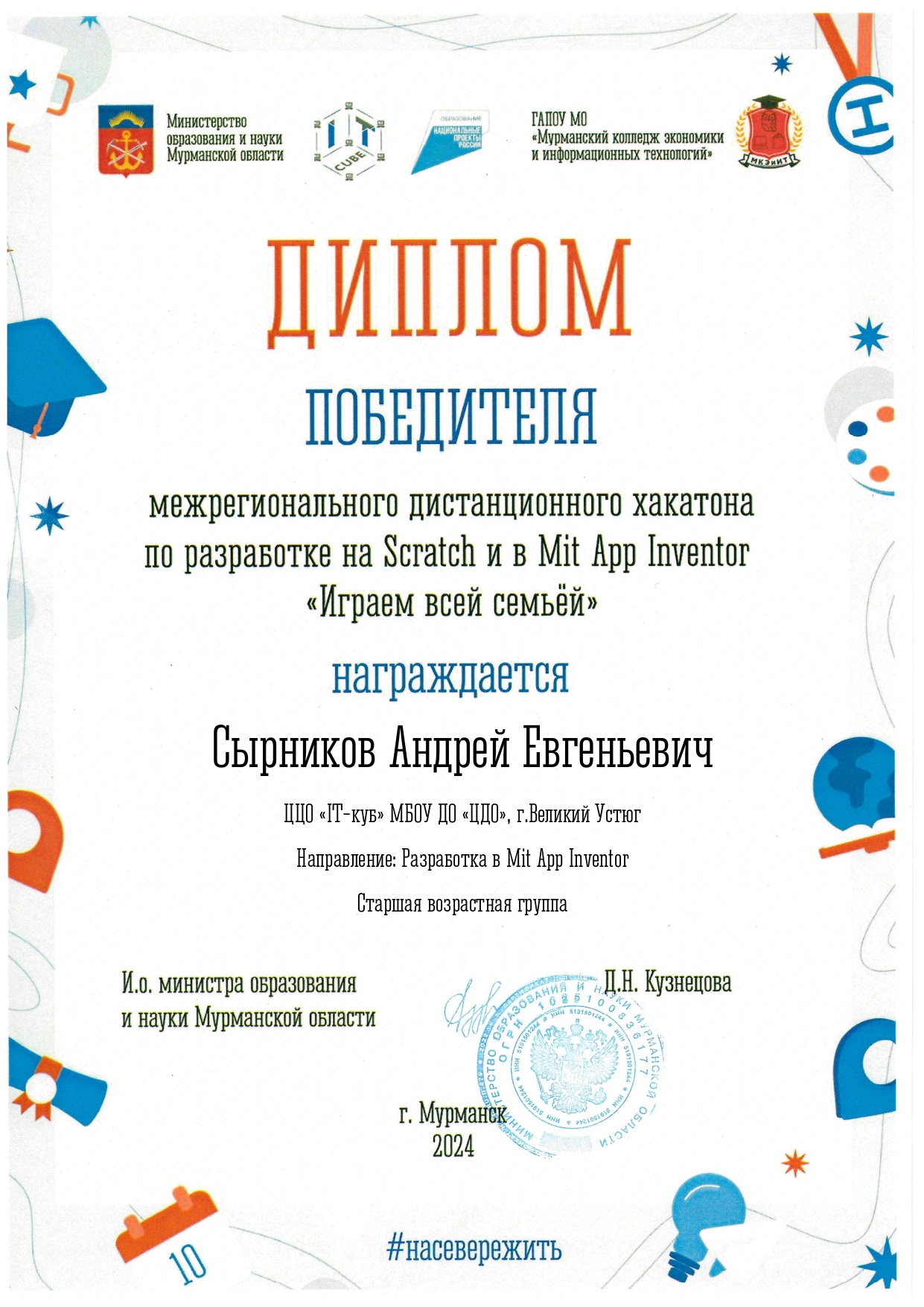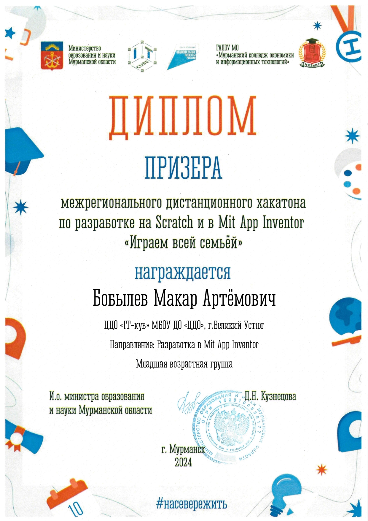 ПРИЗЕРОМ стал Бобылев Макар в направлении «Разработка в MIT App Inventor», младшая возрастная группаРуководитель: Близникевич Яна Алексеевна