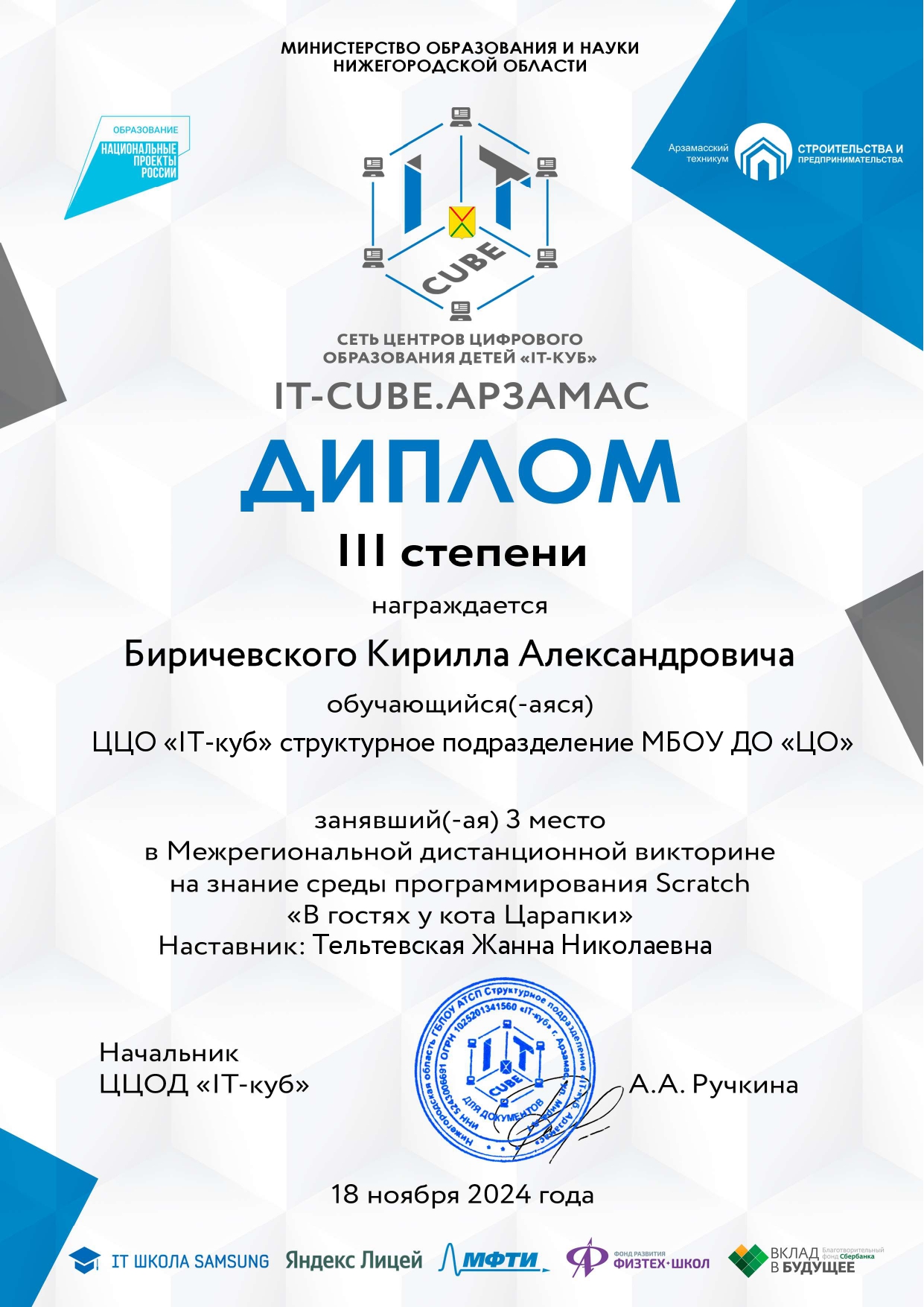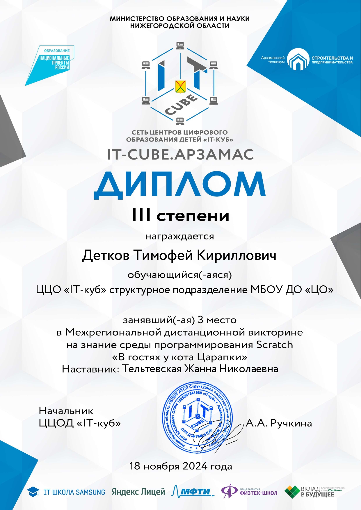 В период с 5 по 18 ноября Центром цифрового образования детей г.Арзамас была проведена дистанционная викторина на знание среды программирования Scratch «В гостях у кота Царапки».